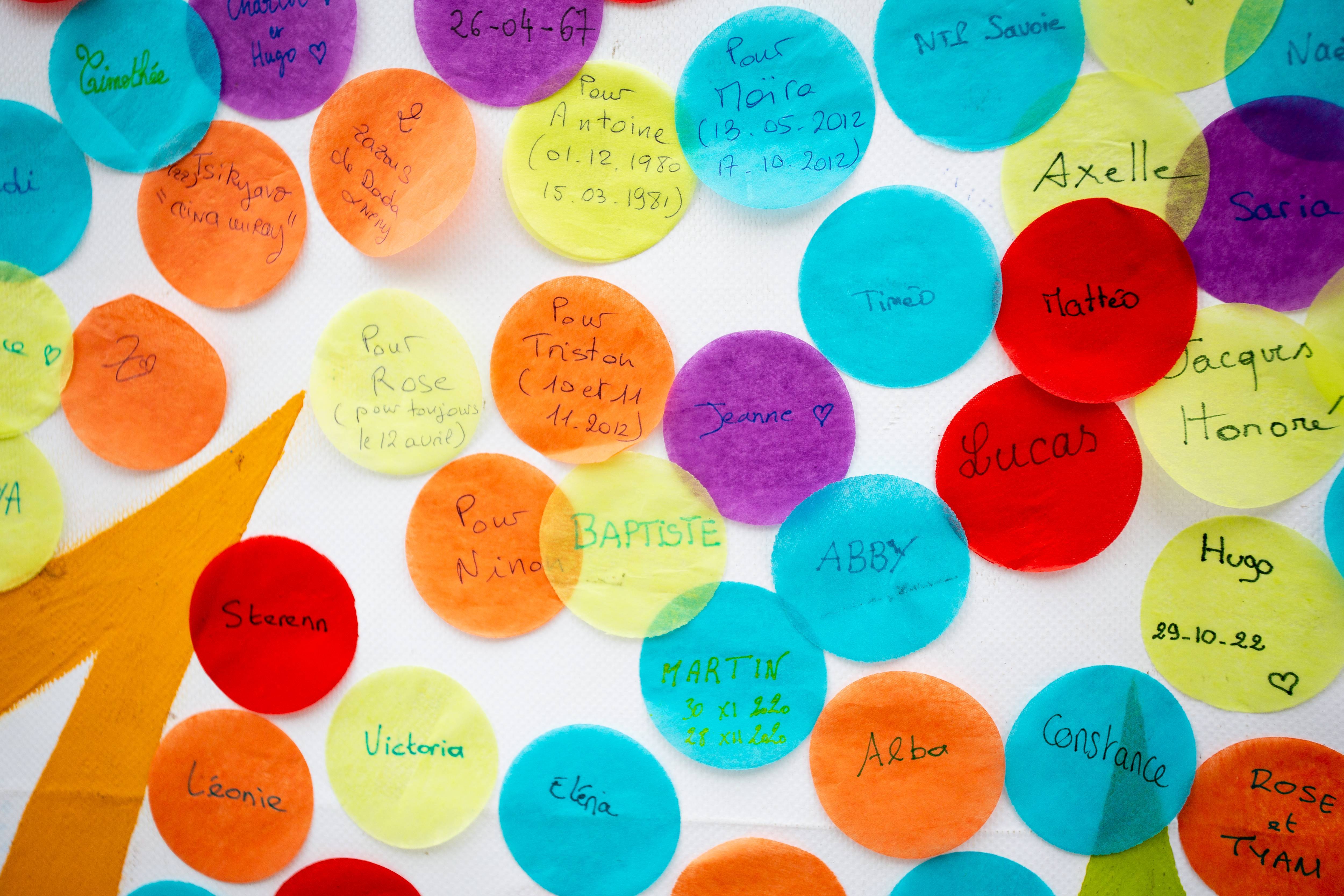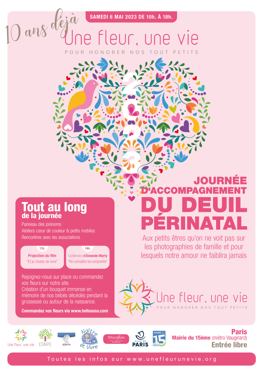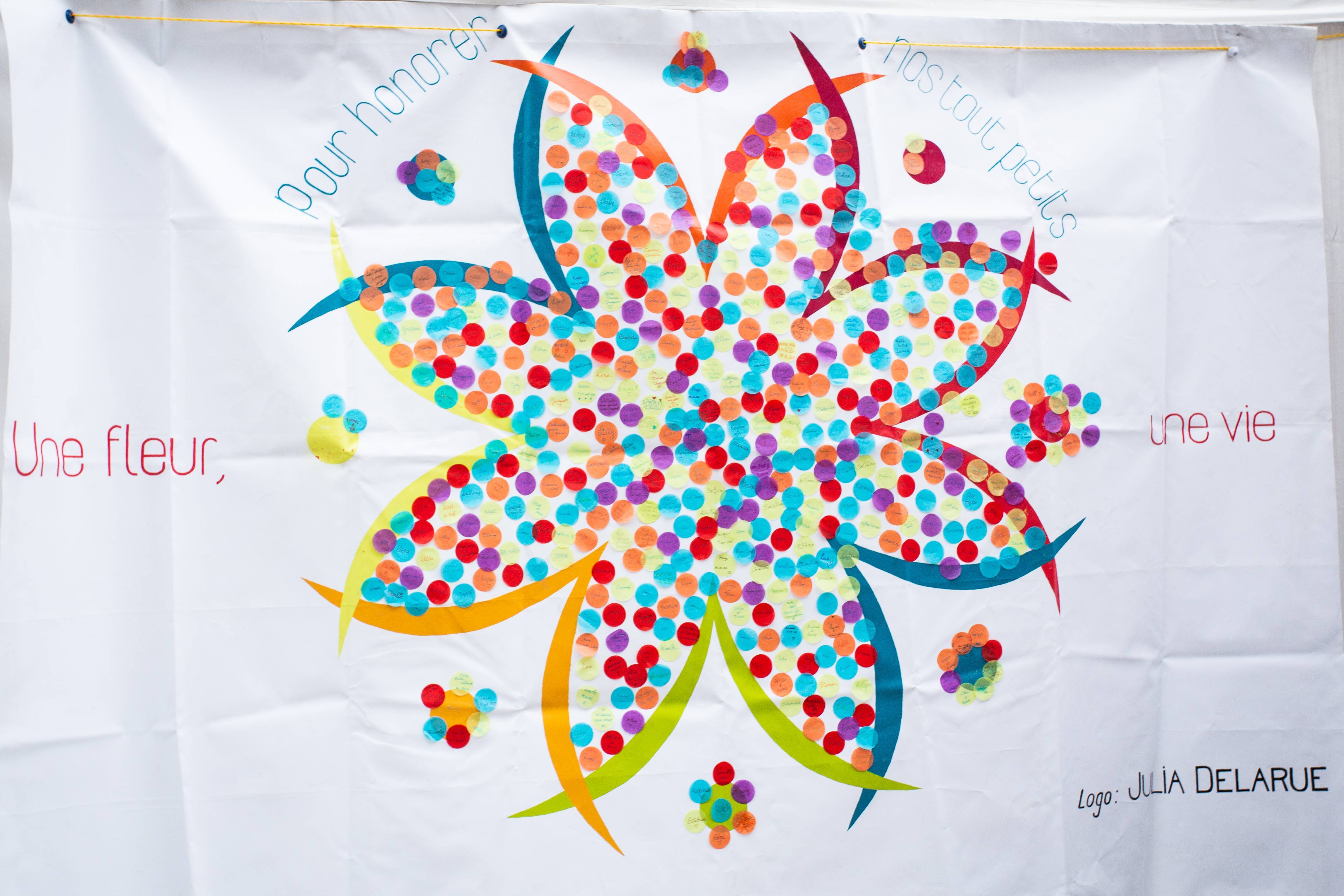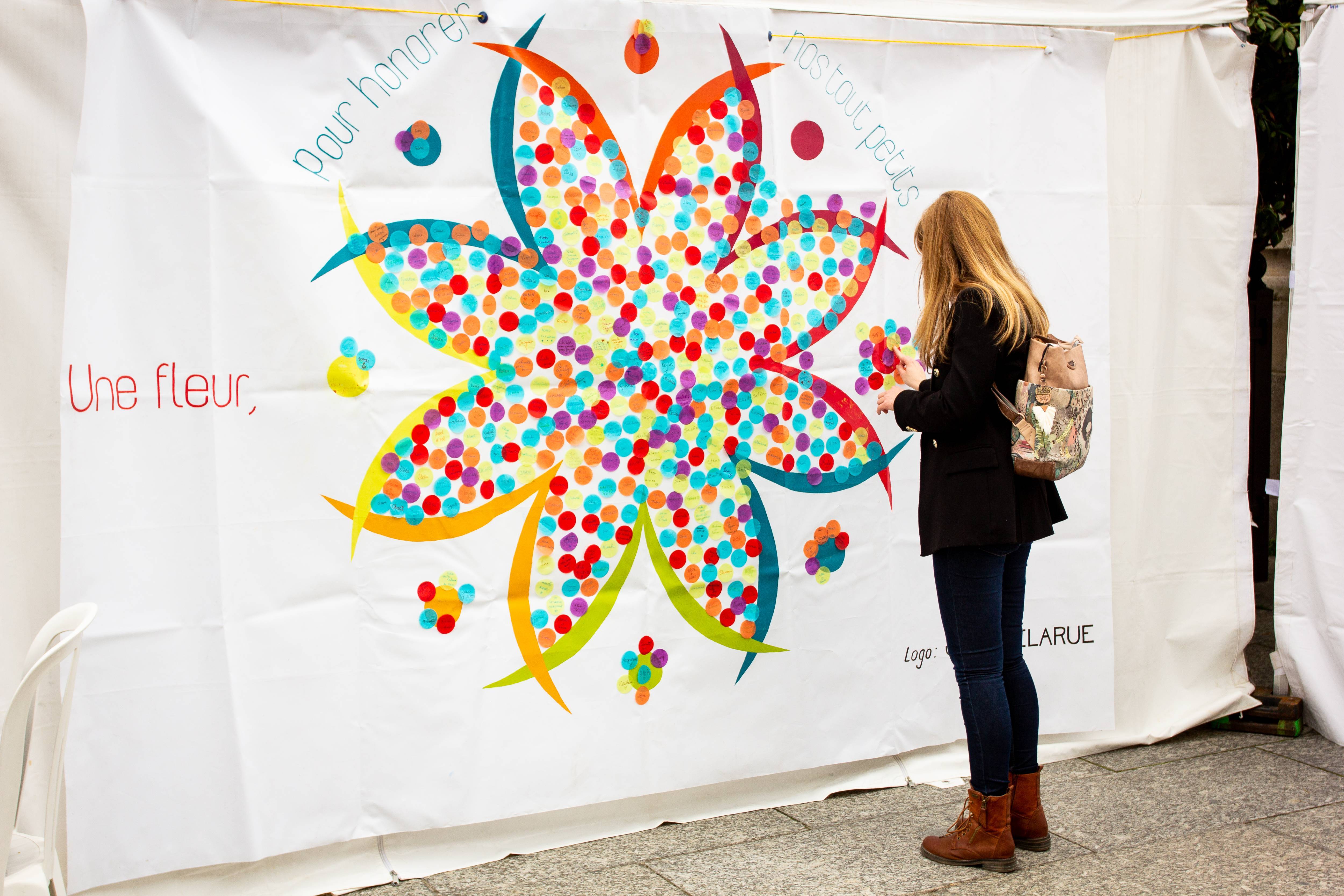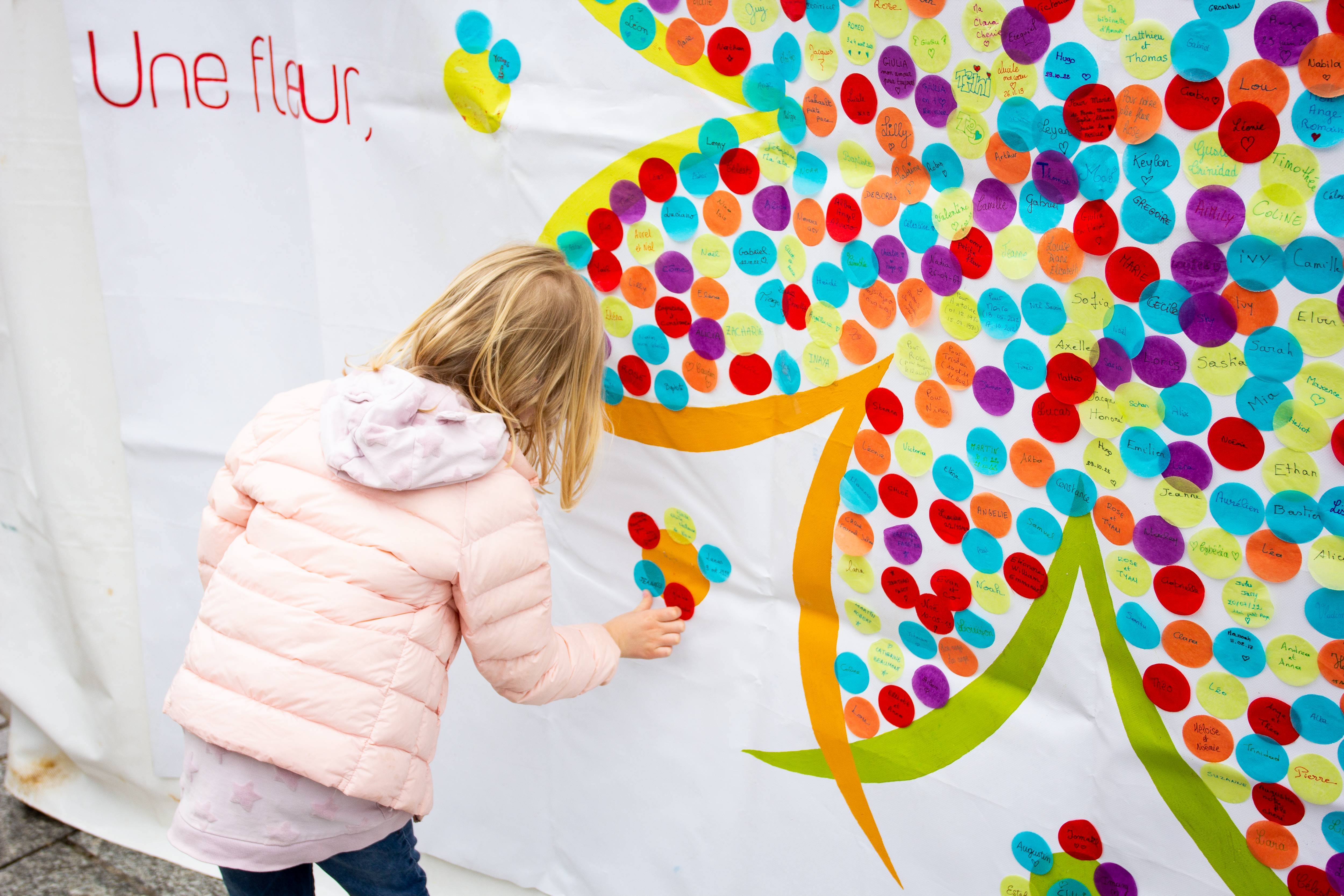 Parents, grands-parents, frères, sœurs ou amis viennent déposer une fleur pour honorer l’existence de ceux dont la courte vie a laissé des traces. Un bouquet immense et coloré se crée au fil de la journée. Ateliers artistiques, groupes de paroles, panneau de prénoms, films, spectacles… un mouvement de création dans un cadre convivial et bienveillant permet de se sentir moins seul et d’avancer, à son rythme, sur son chemin de deuil.