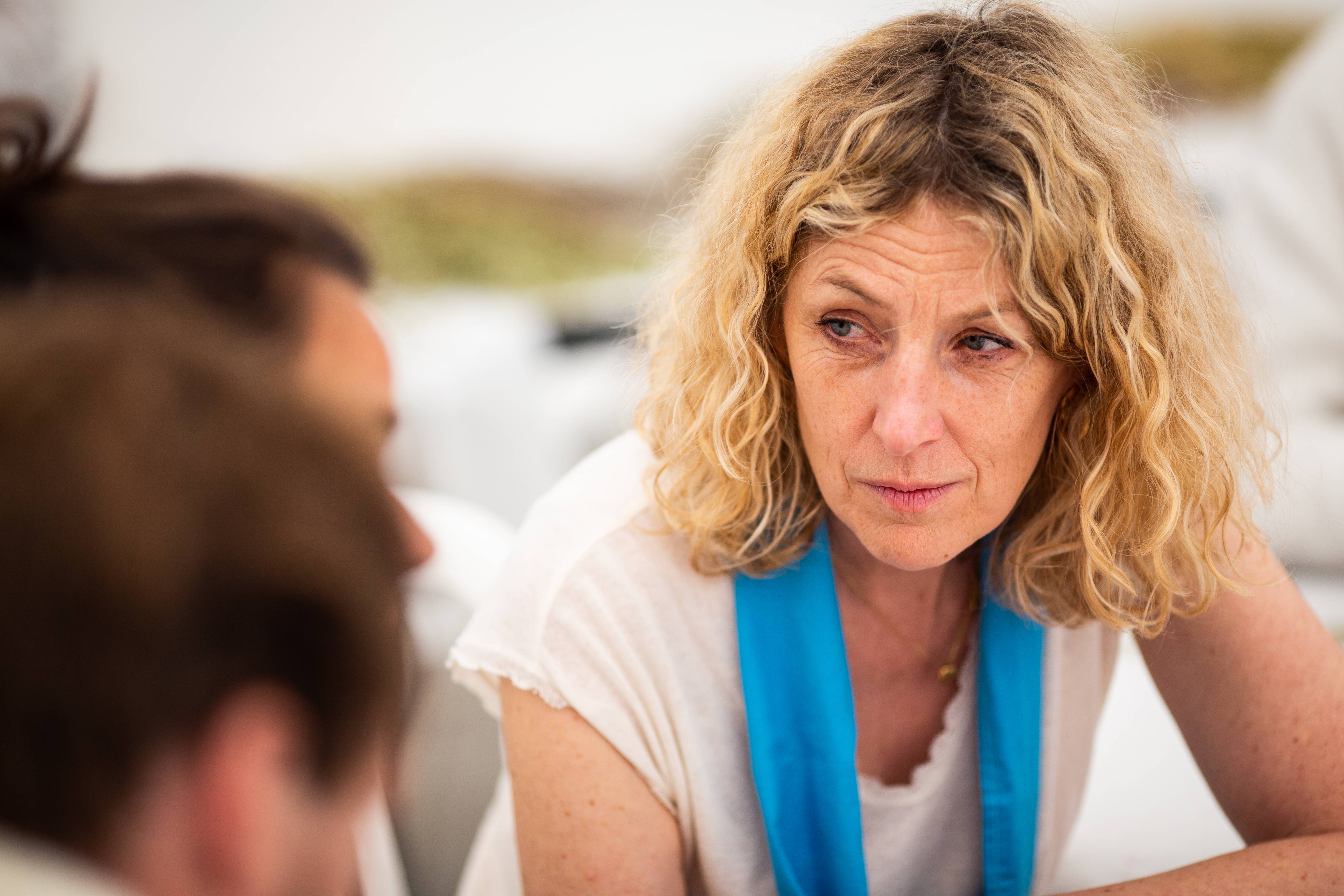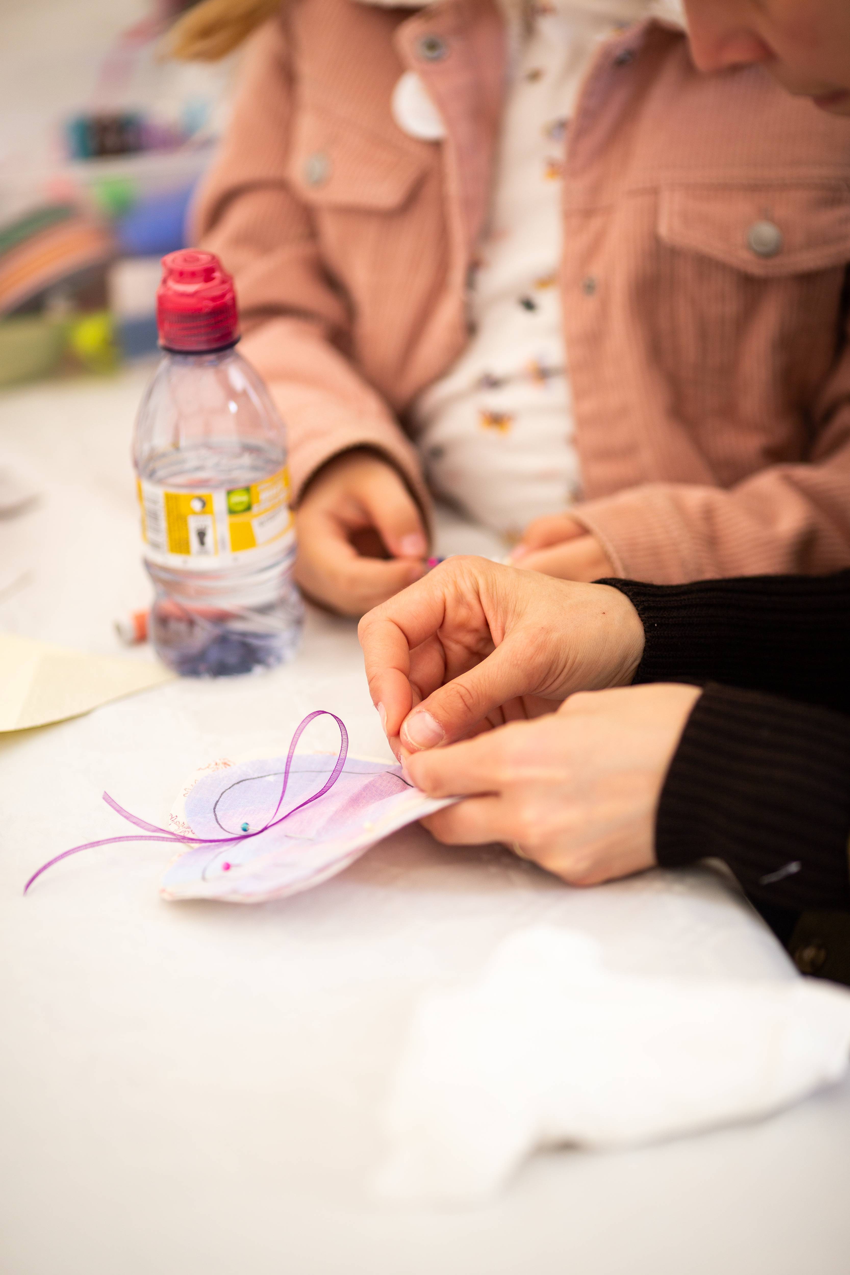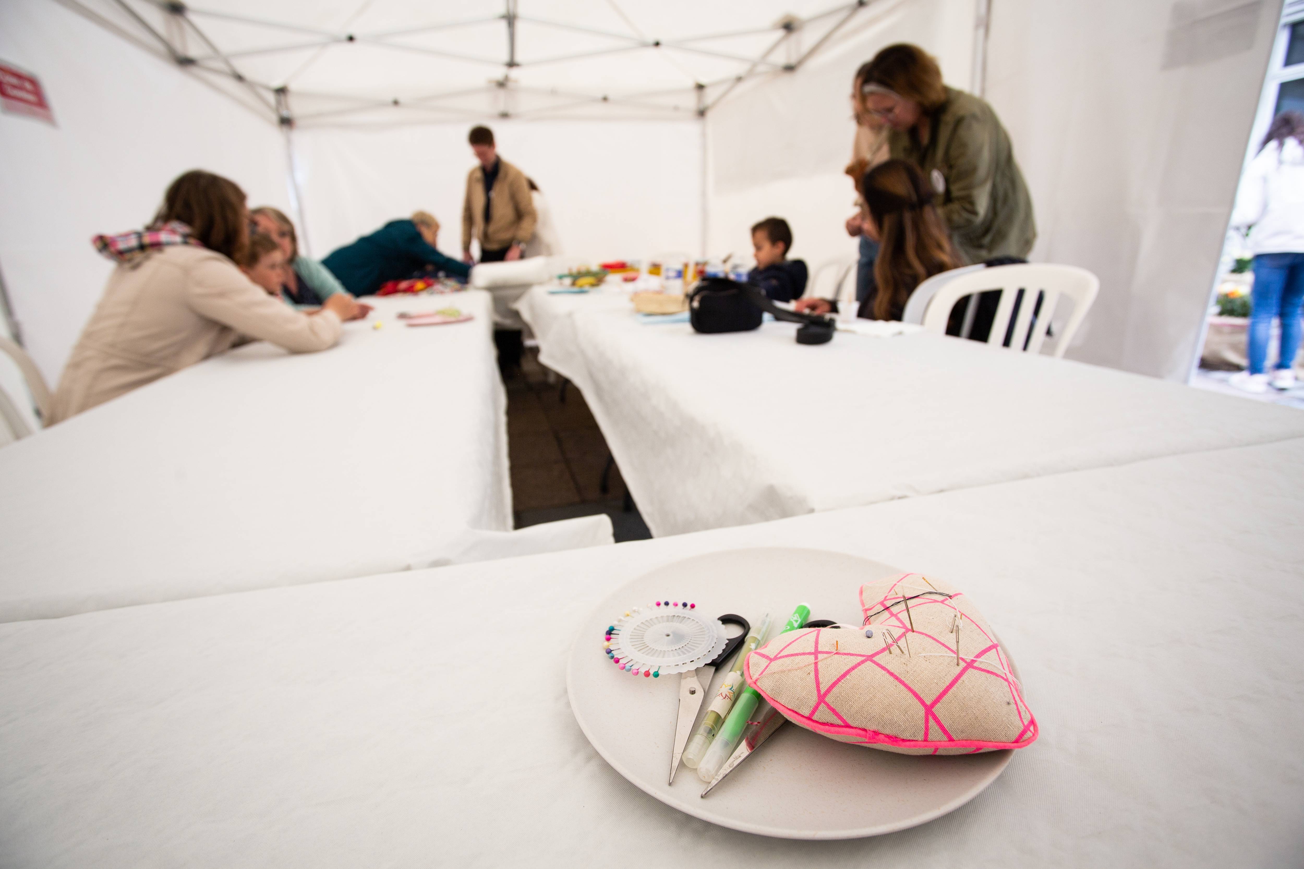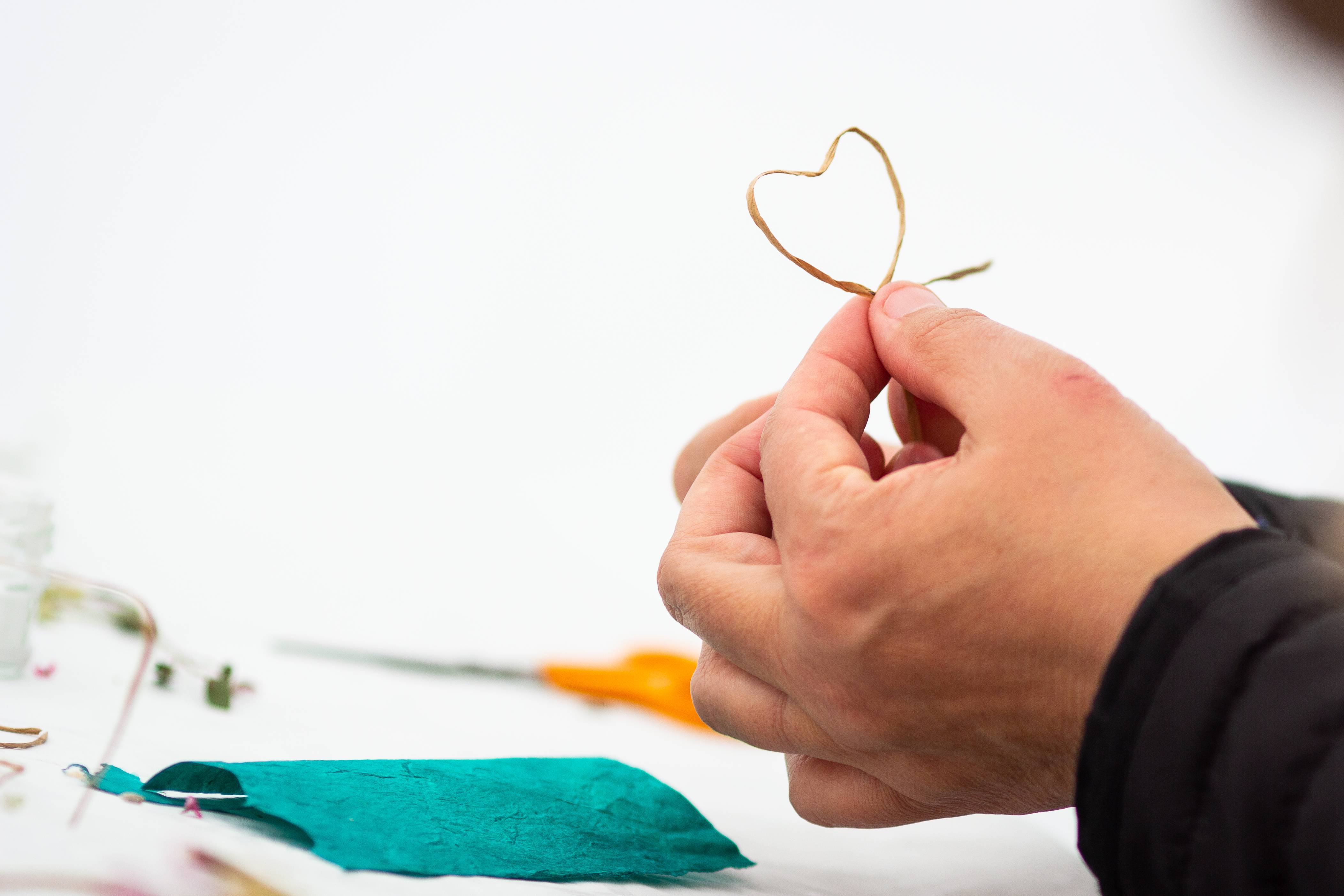 Mon épouse est à mes côtés et parle avec une femme blonde qui l’écoute avec beaucoup de douceur et de bienveillance. Je n’entends rien, je ne comprends rien. Qu’est-ce que je fais là ? Mais je me sens bien, à ma place en cousant un cœur !